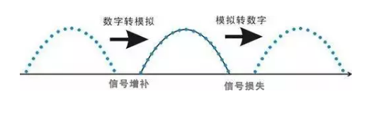 数字信号描述的信号是由一个个点组成的,在信号的变化中是不连贯的,而模拟信号的变化是一个连续的曲线,所以模拟信号的给人的真实感更好。当数字信号转换至模拟信号的时候,直接出来的也是一个个的点(数字信号的采样点),而没有描述的部分会由转换程序自动生成(类似与3D的抗锯齿技术)以形成连续的模拟信号波形。模拟信号转换至数字信号的时候,连续的模拟信号转换为描述一个个点的数字信号,信号变得不完整。从这个过程看,数字信号转换为模拟信号是有增强而不是有损失,而模拟信号转换到数字信号才会有损失。