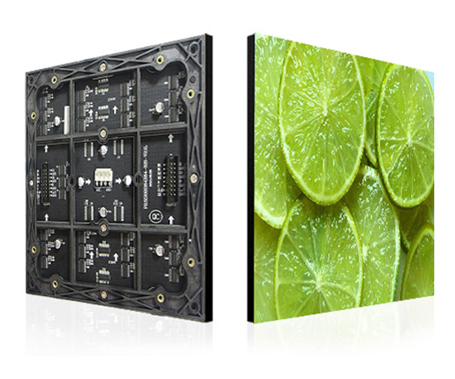 采用高品质红绿蓝三种芯片封装在一颗表贴灯珠里,将表贴灯珠按一定的间距均匀的贴在电路板正面并过焊固定,线路板背面贴有驱动与控制等电子元器件,再用塑胶套件固定和保护成品线路板,这便是室内LED显示屏